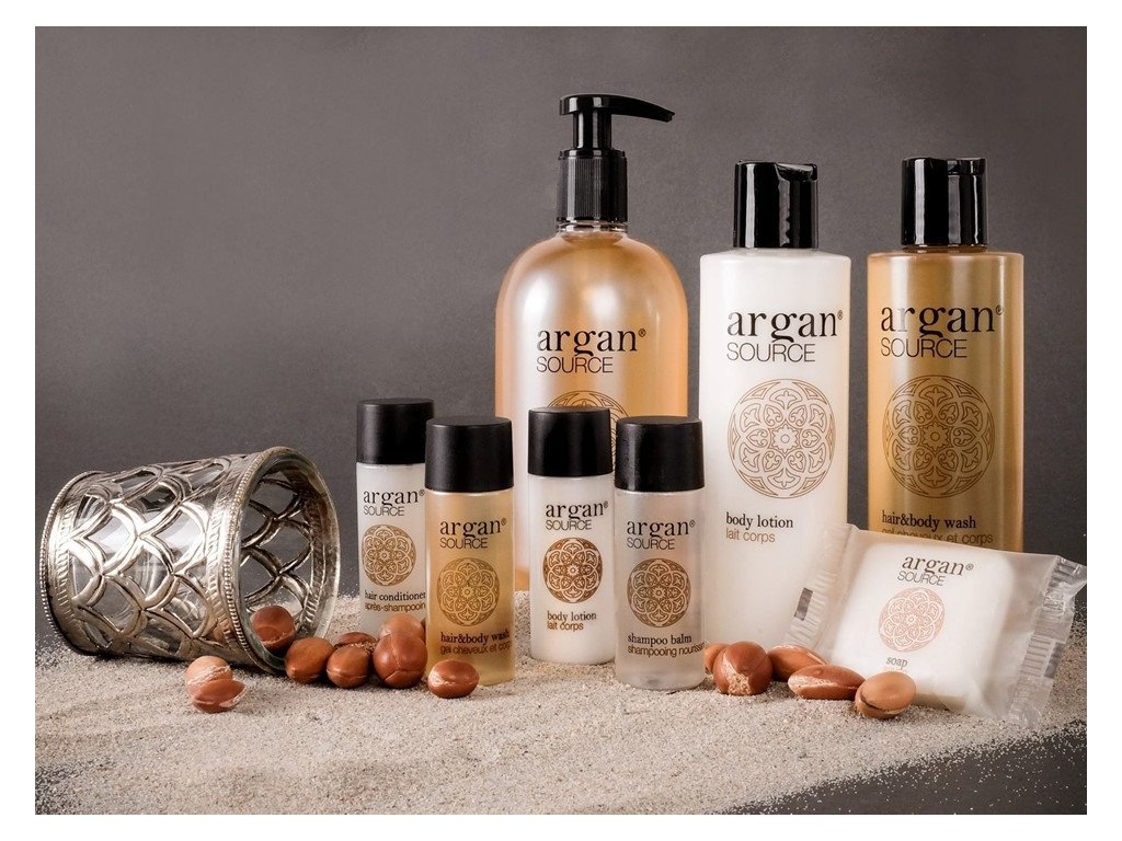 Cosmetice hoteliere ARGAN SOURCE, care conțin ulei de argan organic. Un elixir de frumusețe care a devenit un must-have în produsele de frumusețe datorită antioxidanților săi. De asemenea, are efecte de înmuiere și hidratare. Parfumul încântător și finisajul satinat elegant vă vor introduce oaspeții în atmosfera Marocului. O calitate sofisticată inspirată de aurul deșertului.