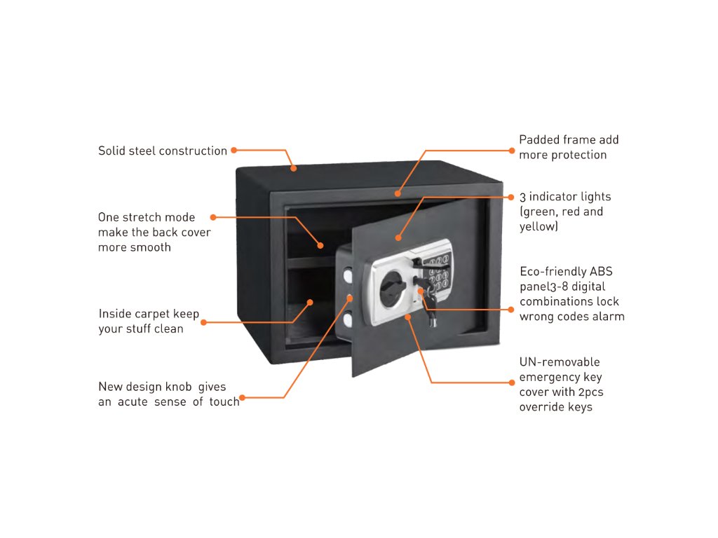 Seif de securitate pentru hotel ENIF - încuiați-vă cu grijă obiectele de valoare. Seiful Enif păstrează confortabil o gamă largă de obiecte, inclusiv documente, pașapoarte, bijuterii, bani și alte obiecte de valoare. Fie că plecați într-o vacanță lungă sau doar vă puneți la curent cu munca, experimentați liniștea sufletească care vine odată cu știința că bunurile dvs. prețioase și importante sunt protejate. Utilizarea ideală a unui seif Enif este și în segmentul de cazare sau în afaceri.