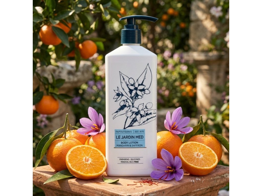 Compoziție finăLE JARDIN MED cu extracte organice atent selecționate de șofran grecesc, salvie grecească organică și struguri, împreună cu parfumuri rafinate și incitante, vă vor transporta oaspeții în cele mai parfumate grădini din Marea Mediterană. Rețete vegane și ambalaje ecologice, reciclate și reciclabile.