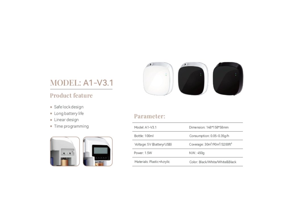 Transformați orice spațiu mic de afaceri, de la toalete la lifturi, cu difuzorul de arome A1-V3.1. Proiectat pentru o integrare perfectă, acesta îmbunătățește atmosfera și ridică fără efort imaginea companiei dvs. De la lansarea sa, acest dispozitiv remarcabil a cucerit inimile din întreaga lume și a câștigat recunoașterea clienților din întreaga lume. Înălțați-vă spațiul cu rafinament și ușurință. Experimentați combinația perfectă de funcționalitate, eleganță și parfum de lungă durată care vă va redefini mediul interior.