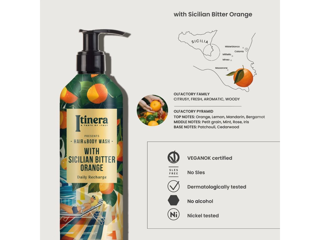 Hair & Body Wash Daily Recharge cu portocală amară siciliană. Pentru un păr vibrant, sănătos și o piele fină. cel puțin 95% ingrediente de origine naturală, atent selecționate pentru eficiența lor.