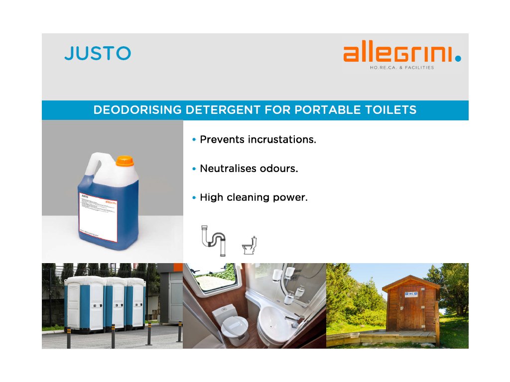 Mirosurile neplăcute cauzate de toalete defecte, toalete portabile și toalete chimice pot fi controlate și eliminate eficient cu detergentul deodorant JUSTO.