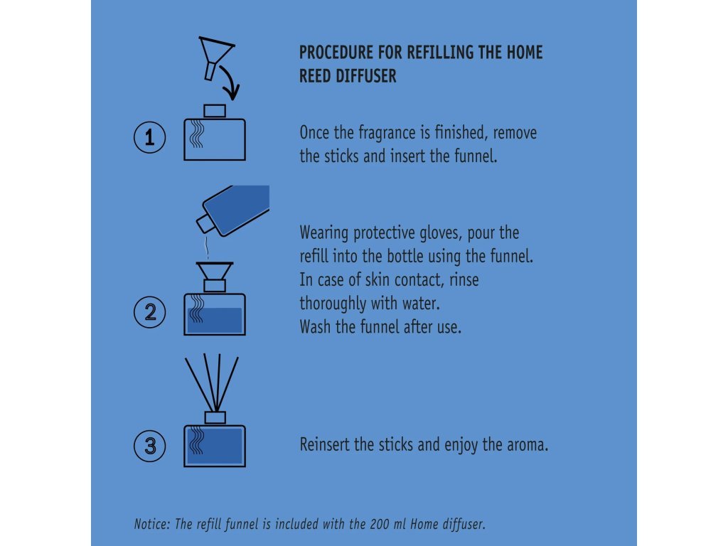 Cum să procedați: Procedura de reumplere a difuzorului de uz casnic 1) Când parfumul este epuizat, scoateți bețișoarele și introduceți pâlnia. 2) Cu mănuși de protecție, turnați reumplerea în sticlă folosind pâlnia. În caz de contact cu pielea, clătiți bine cu apă. 3) Reintroduceți bețișoarele și bucurați-vă de aromă.