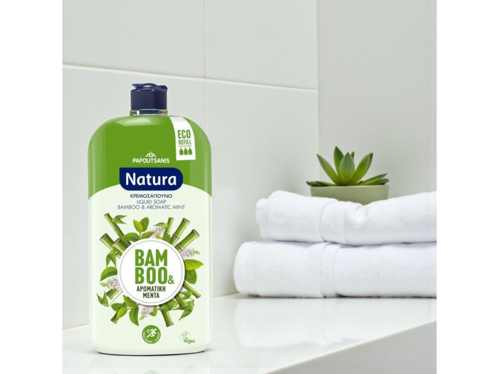 Săpun lichid Papoutsanis Natura cu aromă de bambus și mentă aromată este blând șiprodus vegancare curăță delicat, dar eficient pielea mâinilor fără a o usca. Săpunul are un pH neutru și conține extracte de plante, ceea ce îl face ideal pentru igiena zilnică a întregii familii.