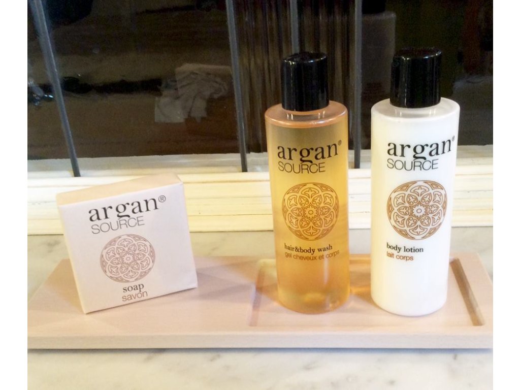 Cosmetice hoteliere ARGAN SOURCE, care conțin ulei de argan organic. Un elixir de frumusețe care a devenit un must-have în produsele de frumusețe datorită antioxidanților săi. De asemenea, are efecte de înmuiere și hidratare. Parfumul încântător și finisajul satinat elegant vă vor introduce oaspeții în atmosfera Marocului. O calitate sofisticată inspirată de aurul deșertului.