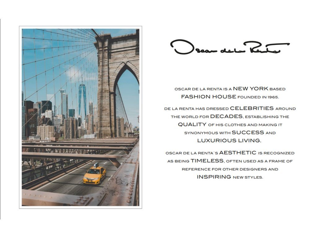 OSCAR DE LA RENTA este o casă de modă din New York fondată în1965. De la Renta îmbracă celebrități din întreaga lume de zeci de ani. El a susținut calitatea hainelor sale și le-a făcut sinonime succes și o viață de lux.