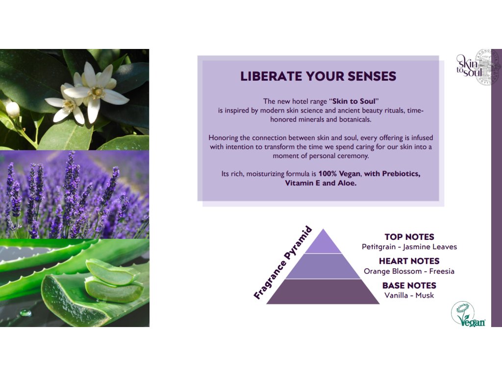 Inspirat de știința modernă și de ritualurile antice de frumusețe, noul gel de duș Skin to Soul onorează legătura profundă dintre corp și suflet. Formula sa bogată și hidratantă are grijă de pielea ta, lăsând-o moale și hidratată. Este 100% vegan și conține prebiotice, vitamina E și aloe vera.