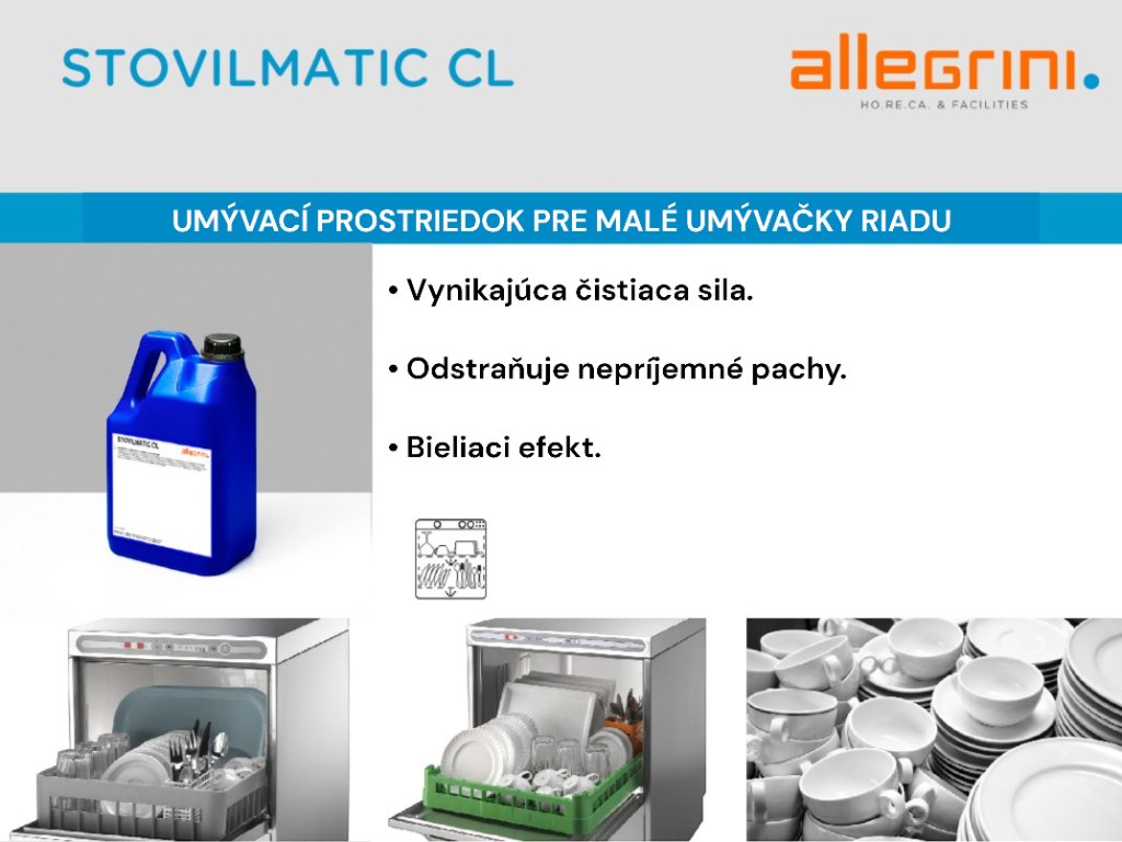 Paharele cu reziduuri de teină și cofeină pot fi o provocare, mai ales atunci când trebuie să spălați zeci de bucăți într-o perioadă scurtă de timp.STOVILMATIC CL este un detergent lichid alcalin cu spumare controlată, ideal pentru curățarea completă și igienică a farfuriilor, ceștilor și paharelor în mașini de spălat vase și mașini de spălat vase mici. Oferă o clătire impecabilă, fără a lăsa reziduuri sau dungi pe vase care sunt întotdeauna perfecte. Prin prezența clorului, elimină mirosurile tipice mașinilor de spălat vase și îndepărtează eficient reziduurile de teină și cofeină, readucând paharele strălucitoare, de un alb imaculat.