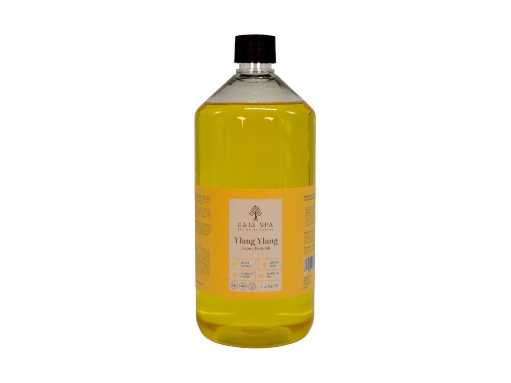 Ulei de masaj corporal de lux Ylang Ylang - GAIA SPA cu un parfum bogat și natural, vă hrănește pielea în profunzime. Răsfățați-vă pielea cu beneficiile luxoase ale unui ulei de corp conceput pentru a vă hidrata și întineri pielea în profunzime. uleiul din flori de Ylang Ylang întinerește, hidratează și tonifică perfect pielea, ajută la normalizarea glandelor sebacee, contribuie la un efect benefic asupra sistemului nervos și ajută la ameliorarea oboselii, iritației și stresului.Parfumul de Ylang Ylang stimulează energia creativă, ajută la restabilirea forței interioare și crește sentimentul de încredere în sine. parfumul dulce este un remediu eficient pentru depresie. Un remediu pentru relaxarea minții și a corpului.