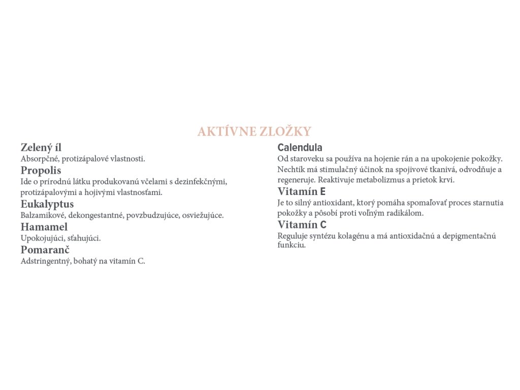 Componente principale: Argilă verde, extract de propolis, eucalipt, villan, calendula, portocale, vitamina E, vitamina C.